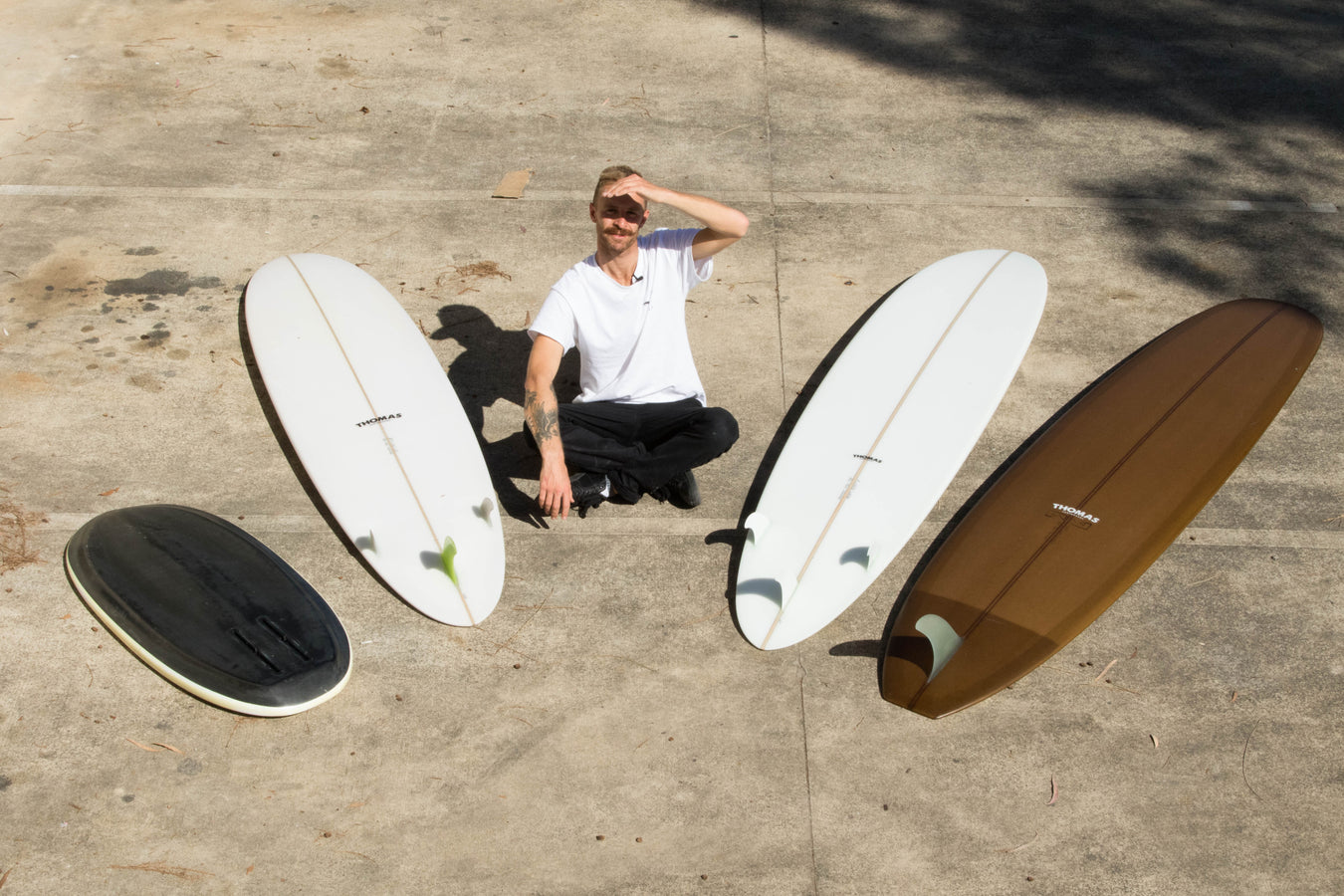 Welsh people say “wasoccurin” when they greet each other, it’s like “what’s up” but better, because nothing’s ever really up and there’s always heaps of shit occurring. Keeping this in mind, we said “wasoccurin” to the one Welsh guy we know well enough, Thomas Surfboards laminator Connor Griffiths. Connor was relishing in the relative warmth of a Noosa Heads Winter, sunning himself in the back carpark at Thomas Surfboards. His four-wheeled patina châteaux faced north and an array of healthy pot plants told of the length to which he’d been estranged from any permanent residence. The broad smile on his dial told of his contentedness. It was 8am and Connor had already lammed the bottom of four new Thomas longboards – all cut laps and an array of colours – and was munging on his breakfast, a bowl of oats.